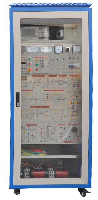 控制柜最上部为示波器放置区和设故箱,中间部分为电源控制部分,实训接线区和相应的监控仪表,装有±300V直流电压表、±2.0A直流电流表和数字转速表用于指示直流电机的运行状态,控制柜下部装有三相同步变压器、三相电流互感器和功率晶闸管??榈?。