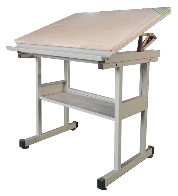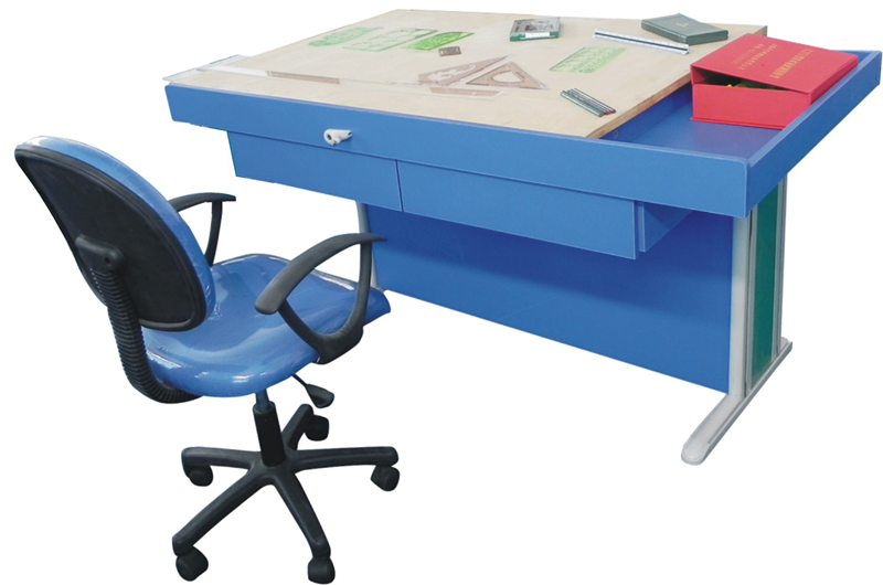 多功能实用绘图桌固定绘图桌支架采用钢架结构,桌面板采用东北优质加厚椴木材料的1号绘图板,并可调节倾角0°-85°,桌面下部有储物隔板,可以放置书包、文具和图纸等物品,牢固耐用,适用于机械制图绘图和绘画专业,在院校内实用和经济的一款多功能和升降绘图绘画桌,有较强的多种行业和课程的兼容性和普及性。