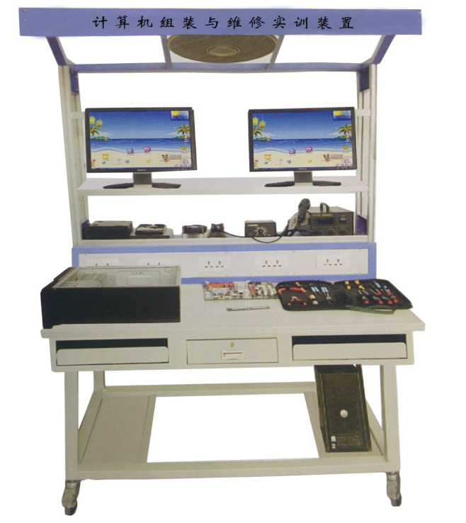 工作台要求采用双工位结构设计,采用工业铝合金型材框架,共两层,其中第一层可放置维修工具、套件、仪器仪表;第二层可放显示器,顶部设有30W日光灯一盏和风扇一台。实训台设有一个抽屉、两个键盘托架、两个主机柜,下方设有四个刹车的万向轮。
