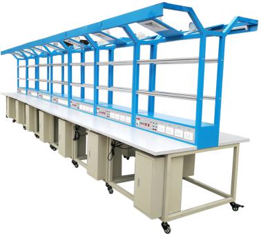 1、台身部分:采用60mm*40mm(壁厚2mm)双竖立柱方钢组成的C型骨架,模具冲压标准化连接件,表面经纯环氧树脂塑粉高温固化处理,具防酸碱、防腐蚀的特点、且承重。桌子的底部采用带固定升降式脚垫,方便调整设备的摆放位置及高度。每工位带铁制柜(上部抽屉、下部柜门、带锁)1只