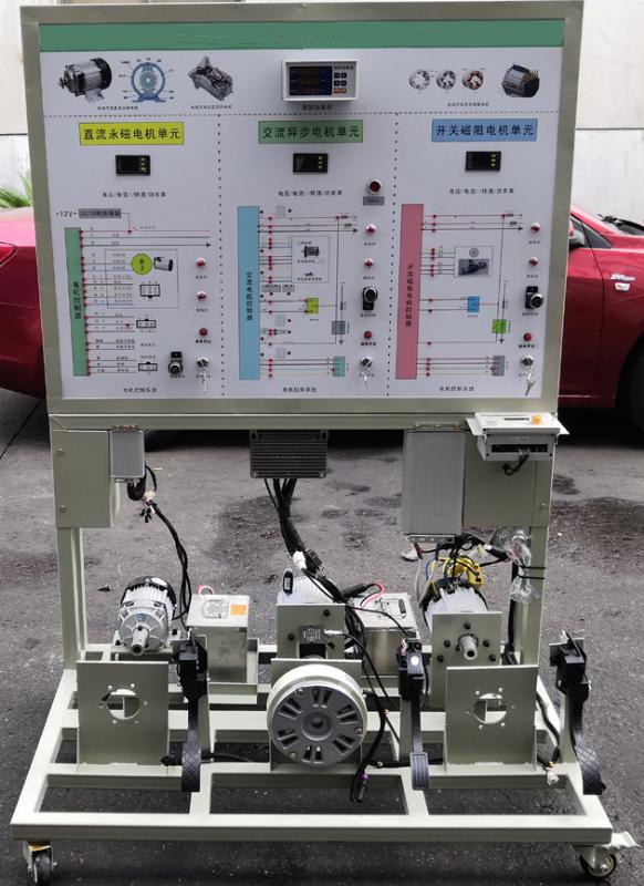 电机性能试验台由实训台架、新能源汽车电池组、三种新能源汽车常用电机(直流永磁、交流异步、开关磁阻)、三种新能源汽车配套电机控制器、加速踏板、档位器、数显电压电流表、转速表、扭矩表、功率表、台式机电脑(外配套)等??樽槌?。