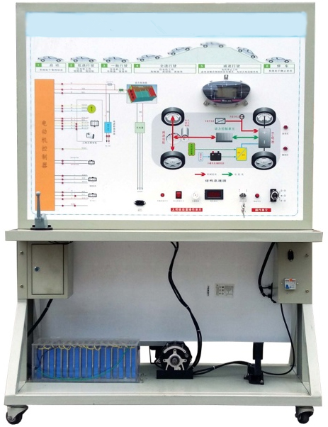 3、面板上安装有点火开关、工况开关、油门踏板、挡位开关、制动开关、转速表、电流指示表、太阳能装置等,装有一台电机用来演示电动机的工作状态,及安装太阳能充电板演示太阳能充电工况。