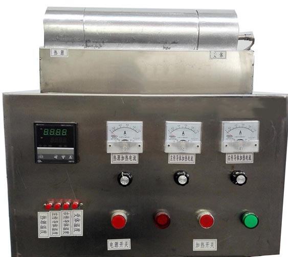 2、加热器功率:3组×200W ,加热温度:≤100℃。 通过对三组加热器电压的调整使热源、传导体的测温点恒定在一定温度,然后测量辐射后的温度。