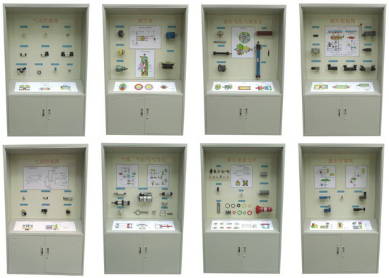 气动液压元件陈列柜采用实物或模型以及必要的图文资料展示常见液压、气动元件的基本类型与基本结构。气动液压元件陈列柜每个模型都配备文字标牌。
