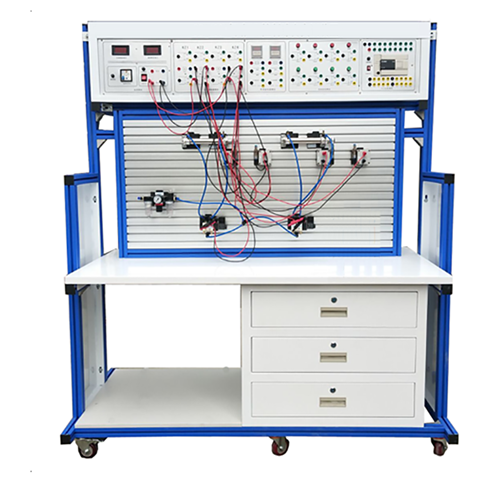 该气动PLC控制综合实训装置采用“平台式设计、模块化组合式应用”的新思路,气动元件选用的工业级器件,力求做到真实、直观,各气动元件配有卡装式快速装接底板。学员根据所设计的气动控制回路要求选用气动元件,快速的通过专门设计的连接装置可方便可靠的锁紧在铝合金实验台上,操作方便、简捷。设备配置有常用气动元件、可编程控制器???,电源???,按钮模块,时间继电器??椋痰缙髂?榈绕骷?,学生可独立地进行气压回路设计、安装、调试、故障排除、编制控制程序等操作实训,从而提高学生的学习兴趣、增强实践动手能力、独立思考问题和解决问题的能力。