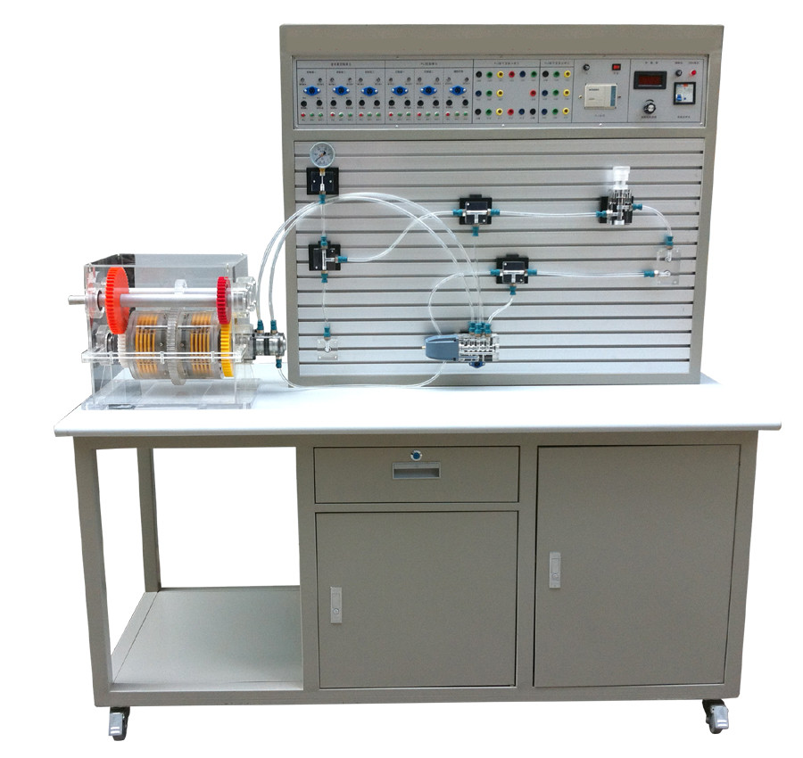 透明湿式离合器变速箱与液压元件外壳采用透明有机玻璃加工而成,油路采用防漏透明油管,能清晰直观的观察到元件内部结构和液压流动过程。真实演示湿式离合器变速箱摩擦片分离、结合、换挡、变速动作??煽枰貉勾菔尽⒘街挚刂品绞絇LC控制与继电器控制的基本回路。适合大中专院?;缋嘧ㄒ?ldquo;液压传动”、“液压与气压传动”等课程的教学实验需要。