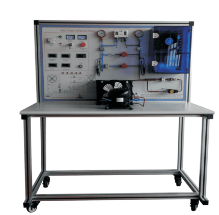 实训台提供1/9匹冰箱制冷压缩机QD60(85W 0.65A R12)、直冷式蒸发器(铝复合板吹胀式蒸发器及下蒸发器、、冷凝风扇照明灯及门开关双金属片热?;ぜ痰缙?、PTC启动器、重锤启动器、毛细管。